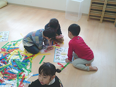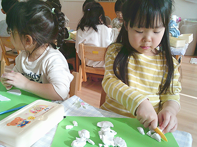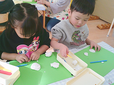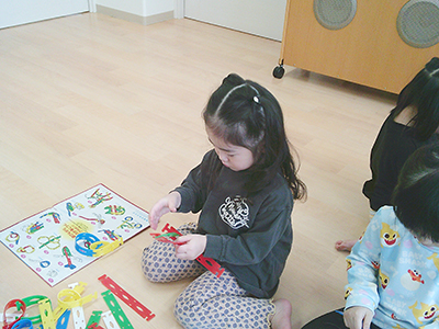 コマ回し大会では、ほとんどのお友達が自分で巻きまわせるようになり、全員よく頑張りました♪ また、外遊びは気温が低く行けていませんが、製作やホールでの活動等を楽しんでいますよ!