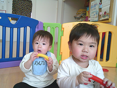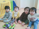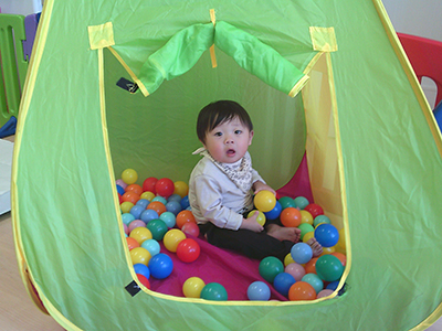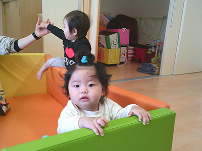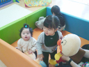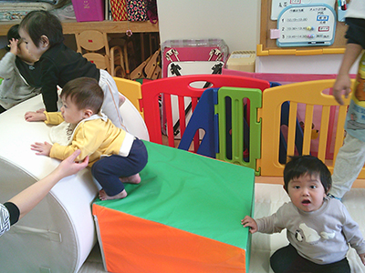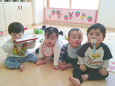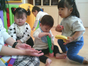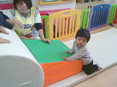 お部屋遊びではブロック遊びや幼児マット遊び、製作などを楽しんでいる子ども達。一人一人の動きが活発になってきて、走り回ったり、ハイハイで動き回ったり、つたえ歩きで動き回る毎日を過ごしています。